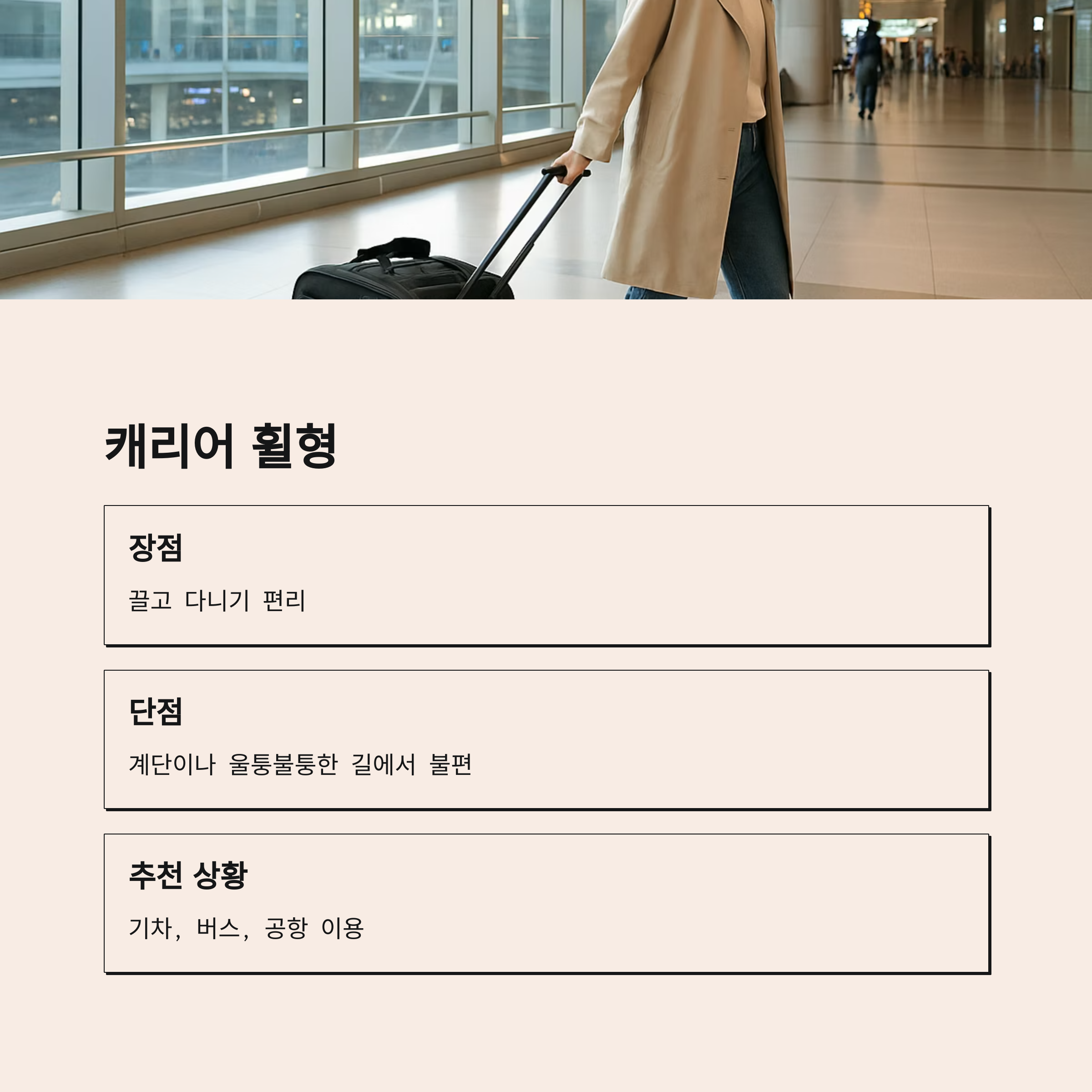 | 캐리어 휠형 | 여행, 장거리 이동 | 끌고 다니기 편리 | 계단·울퉁불퉁 길 불편 |