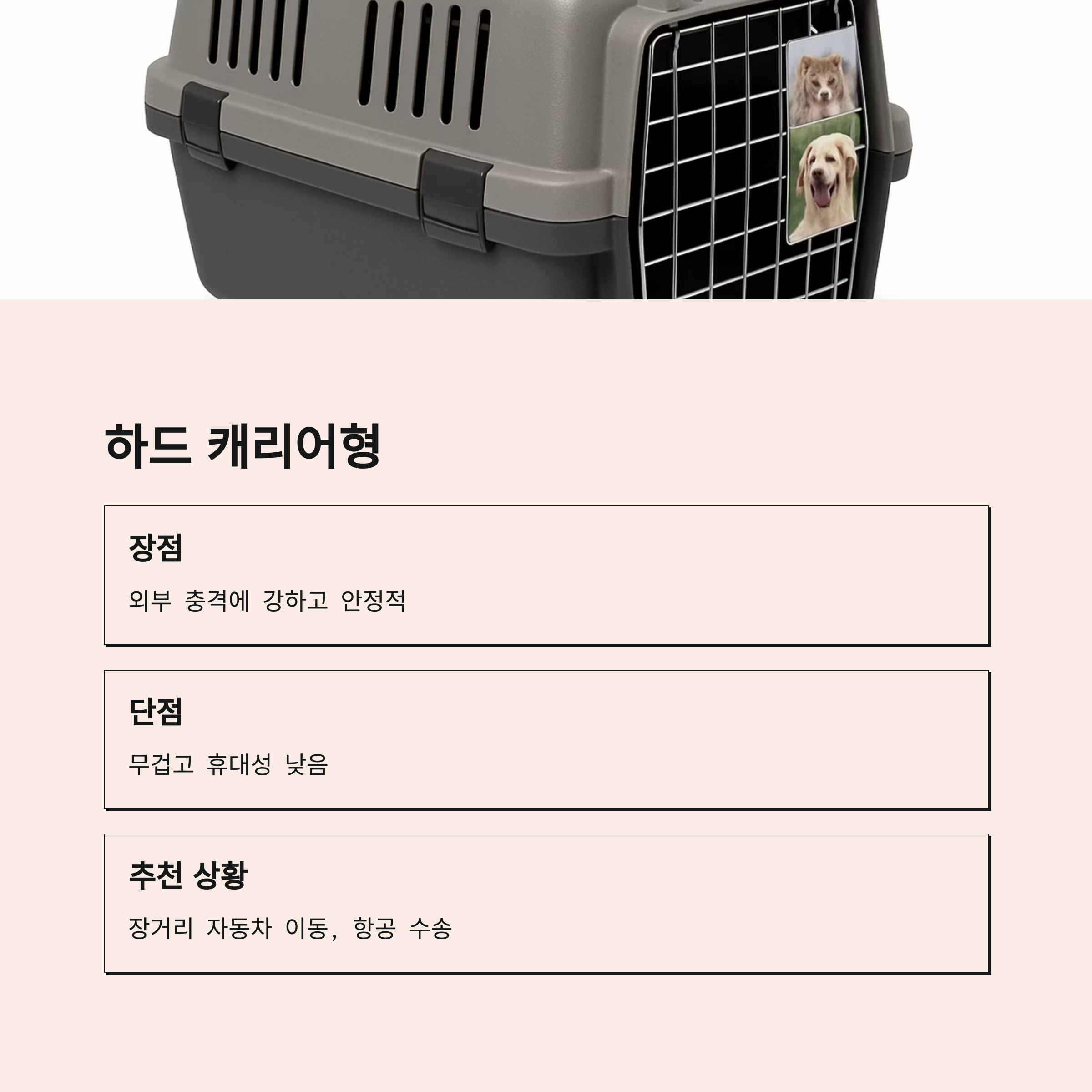 → 하드 캐리어형 또는 휠형 이동장이 안전성 면에서 최적입니다.