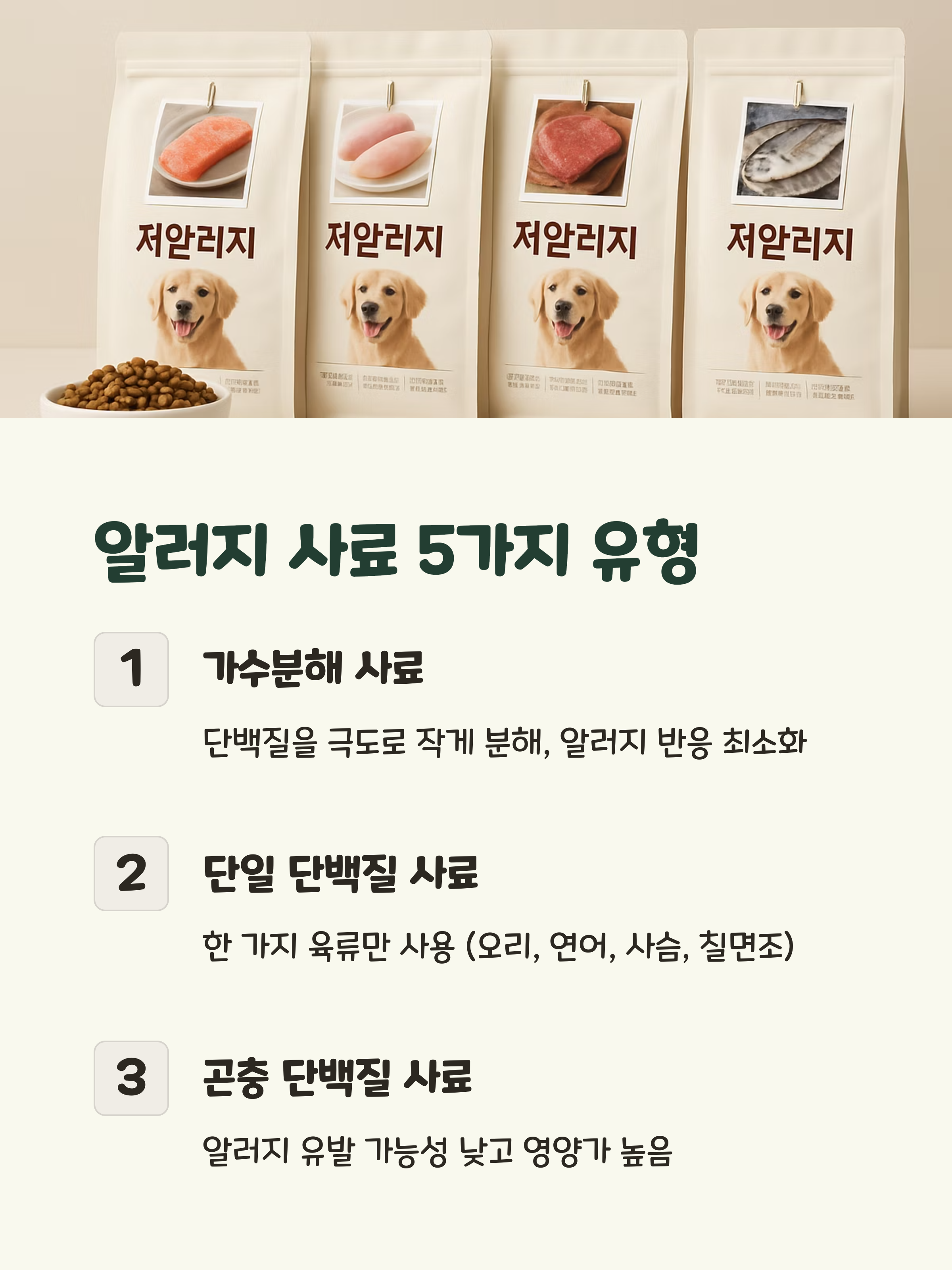알러지 문제를 해결하기 위한 사료는 크게 다섯 가지 유형으로 나눌 수 있습니다. 각 유형별 특징을 살펴보고 우리 강아지에게 맞는 사료를 선택해보세요!